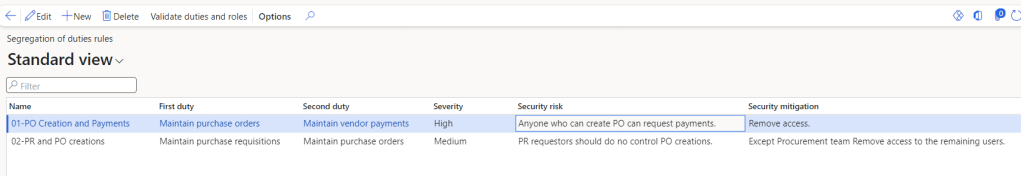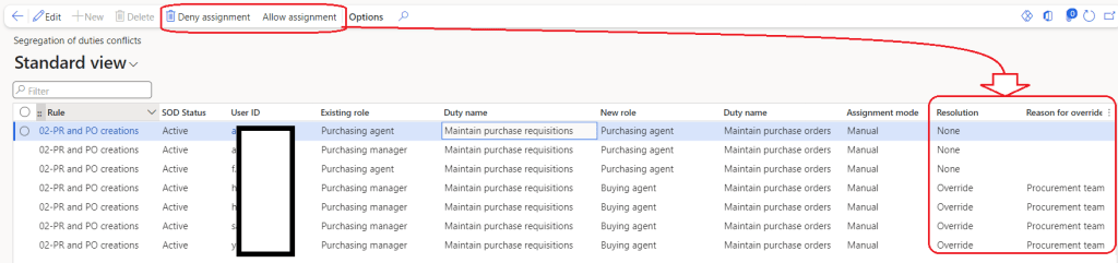 In Dynamics 365 Finance and Operations we can define the duty segregations. If a conflict occurs between duties then a list of users is displayed. Then admin should take action like removing the access or grant because they should have access even if there is a conflict. Example: Purchase requisition creator should not create Purchase orders however exception is applied to the purchase agent.